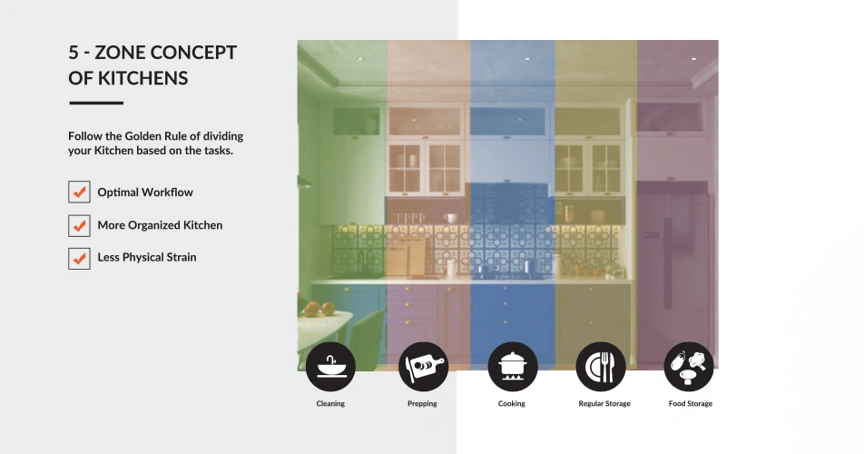 Beyond the work triangle, consider creating dedicated zones in your modular kitchen for specific tasks. For example, have a separate prep zone with ample countertop space, a cooking zone with easy access to utensils and ingredients, and a cleanup zone with a dishwasher and waste disposal.