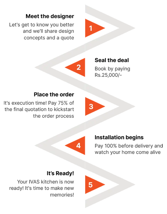 IVAS Modular Kitchens offers a wide range of services to help you create your dream kitchen from Design Consultation, Site Visit, Material and Color options, Appliances, Hardware Fittings, Transportation, Installation to After Sales Service.